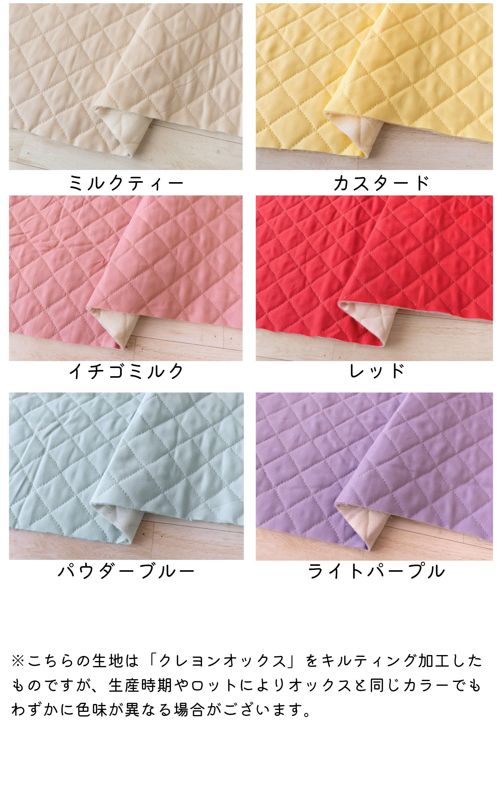 ※こちらは「クレヨンオックス」をキルト加工したものですが、生産時期やロットによりオックスと同じカラーでも多少色味が異なる場合があります。