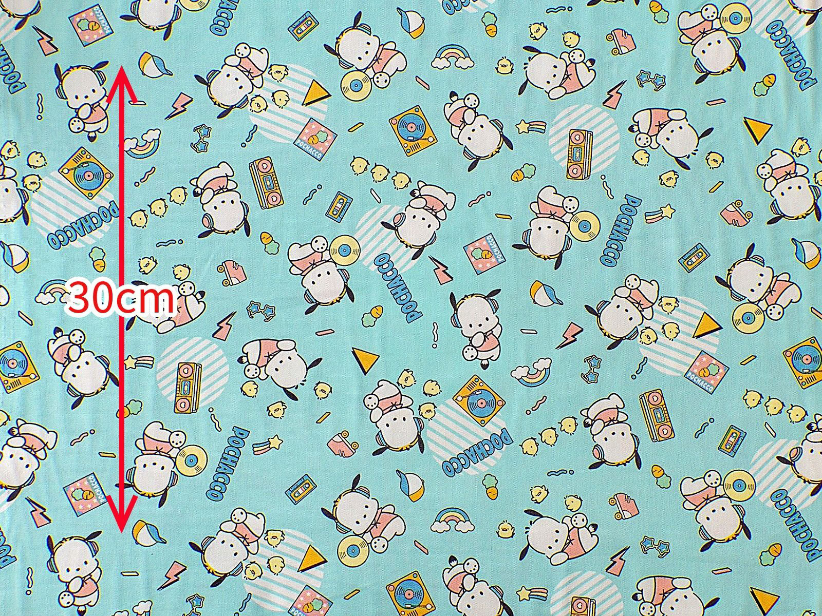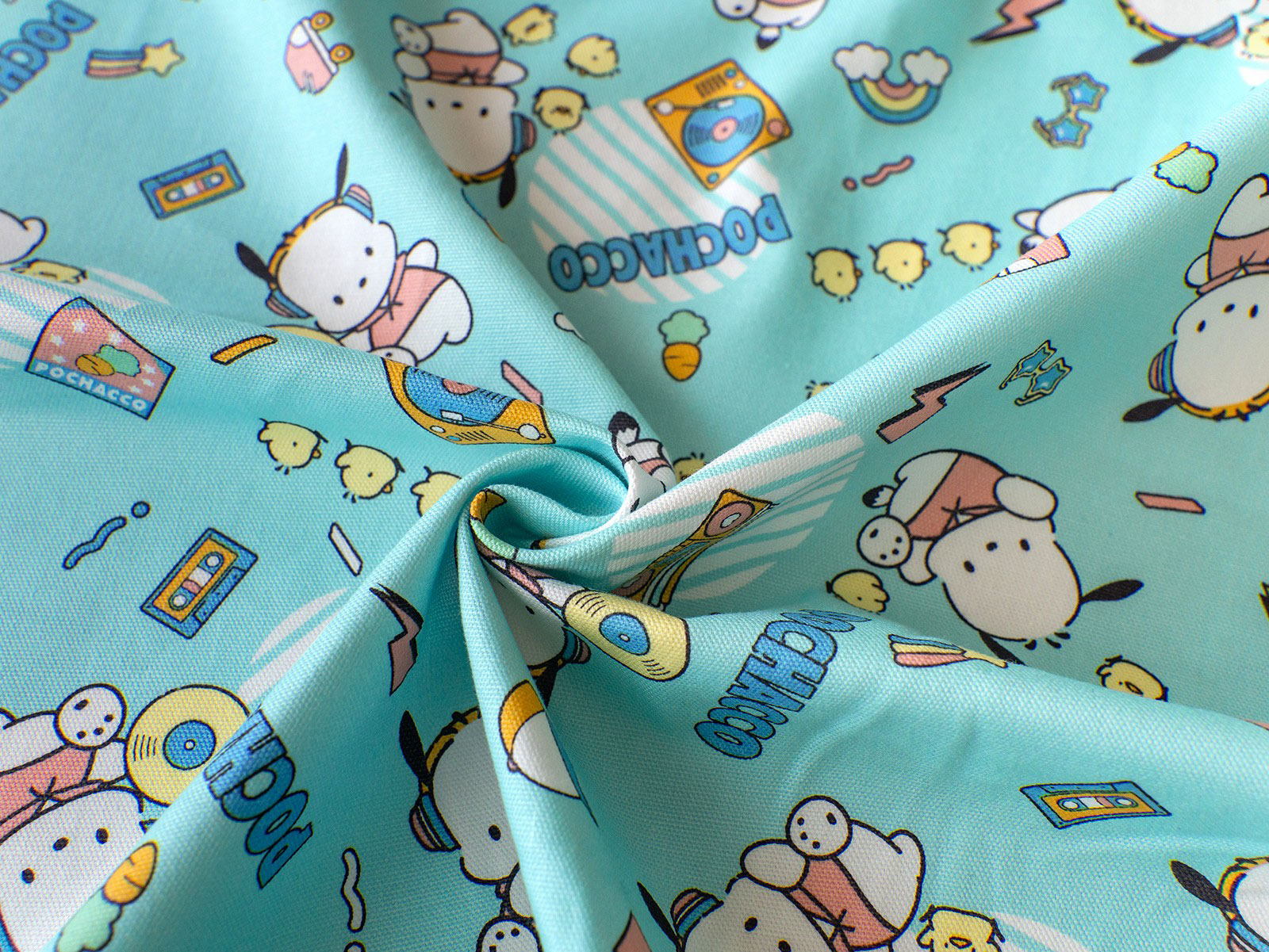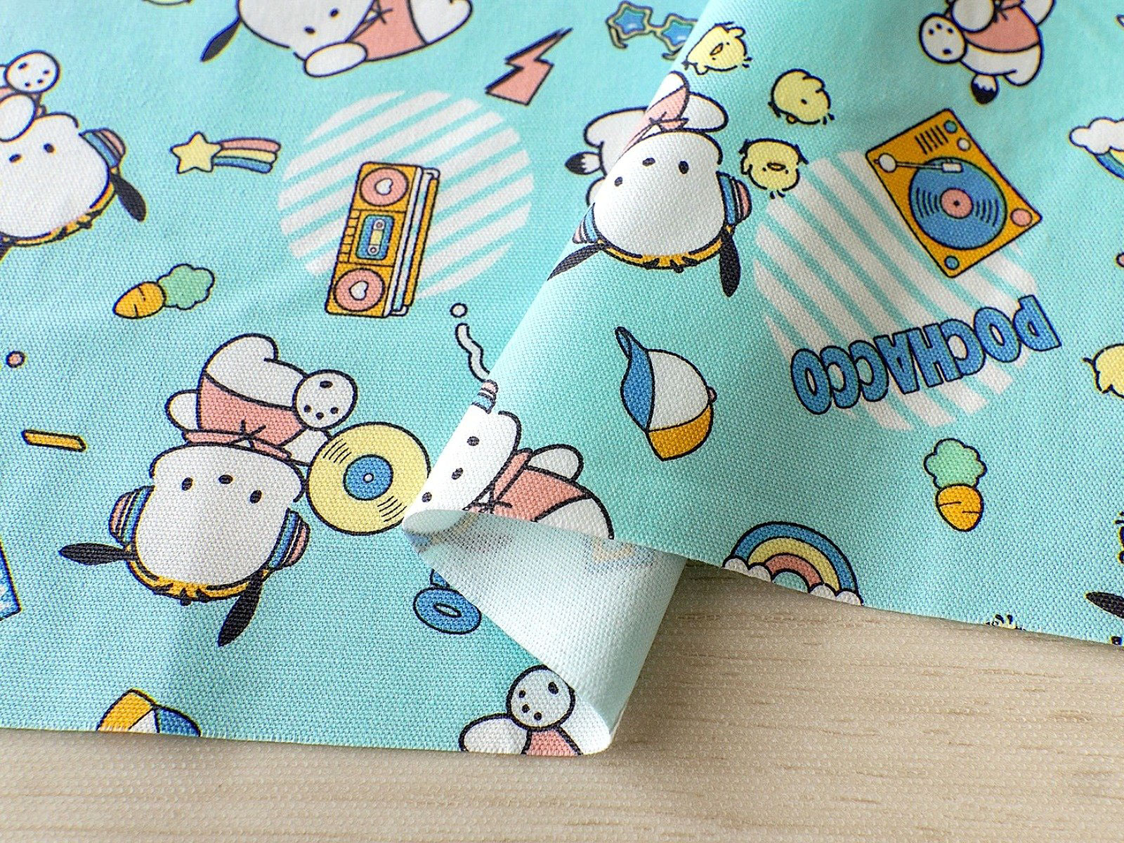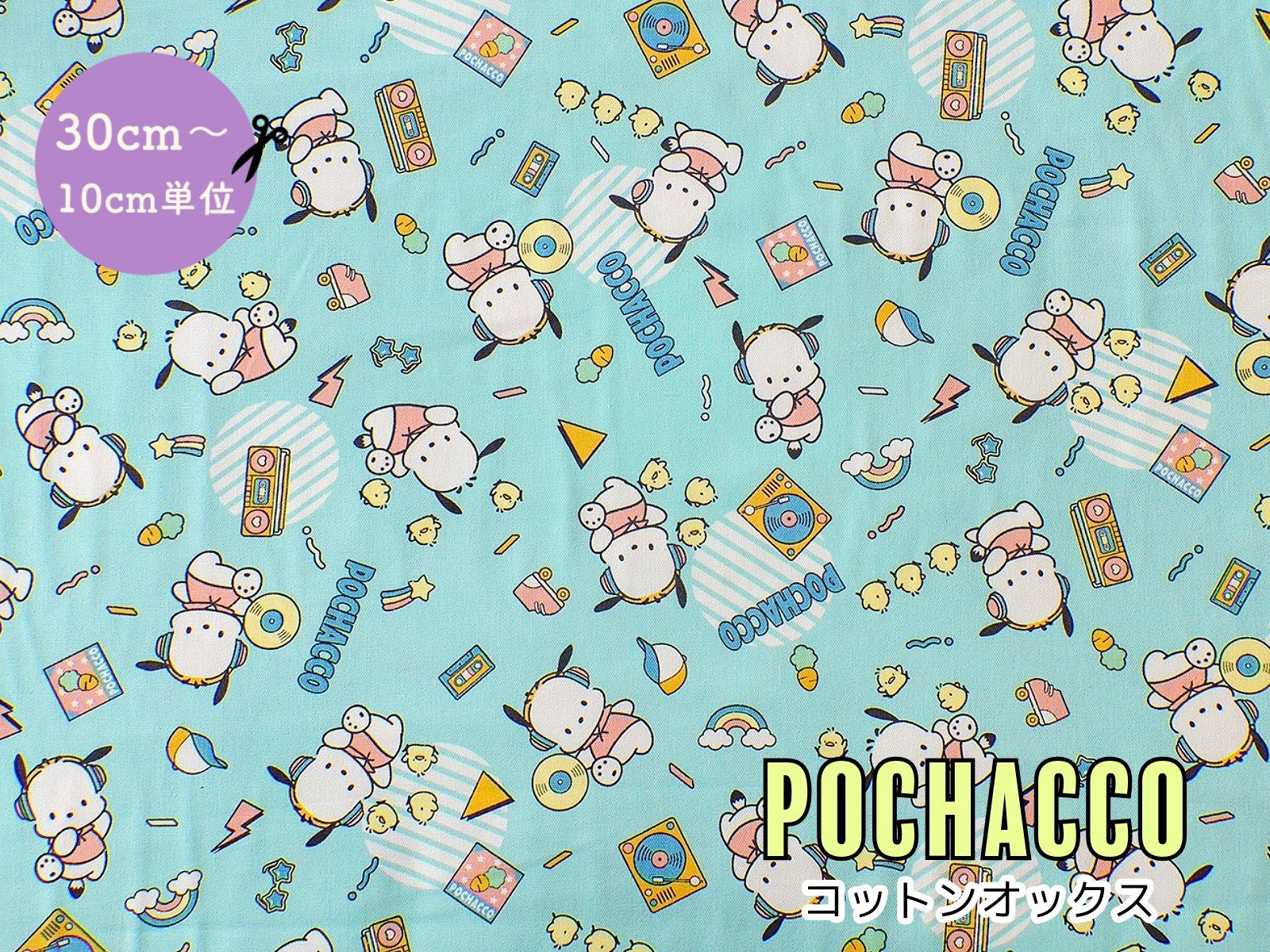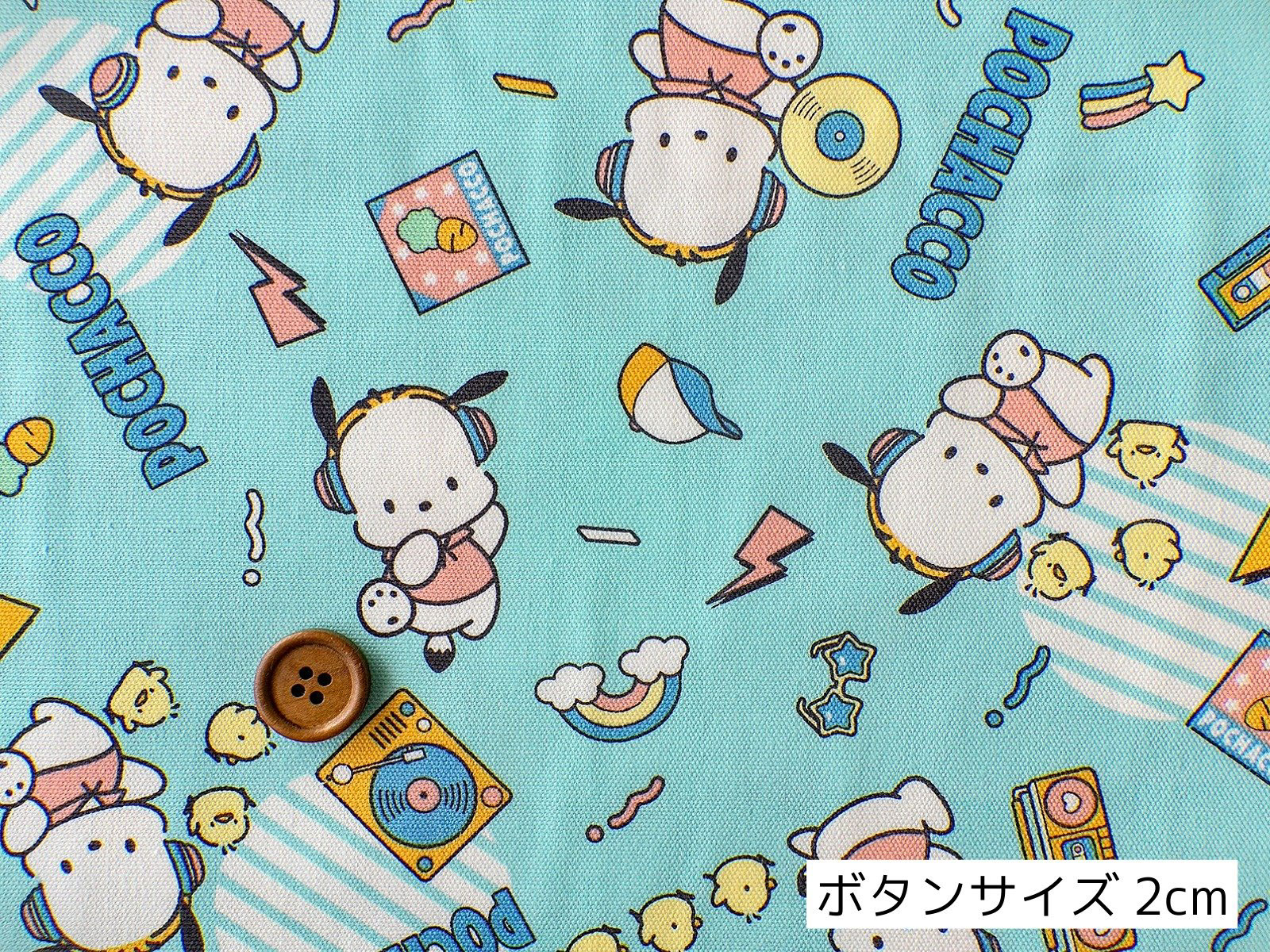 サンリオの人気のキャラクターポチャッコが、ラジカセやレコードで音楽を楽しんでいる様子が描かれたちょっとレトロな雰囲気が可愛いオックス生地。
