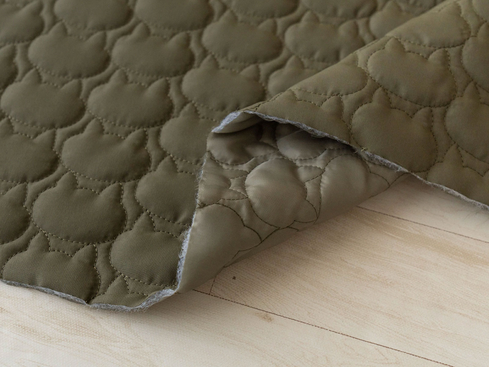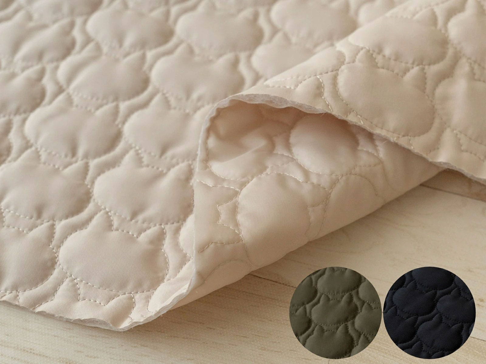 ステッチによって柄が立体的に仕立てられた、ポリエステルのキルティング生地。