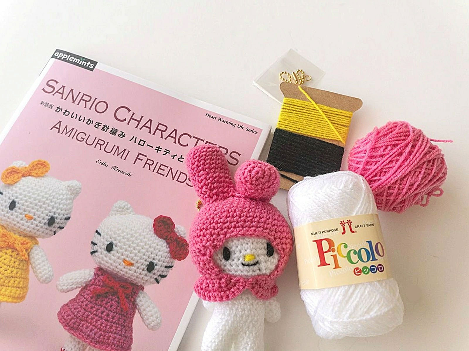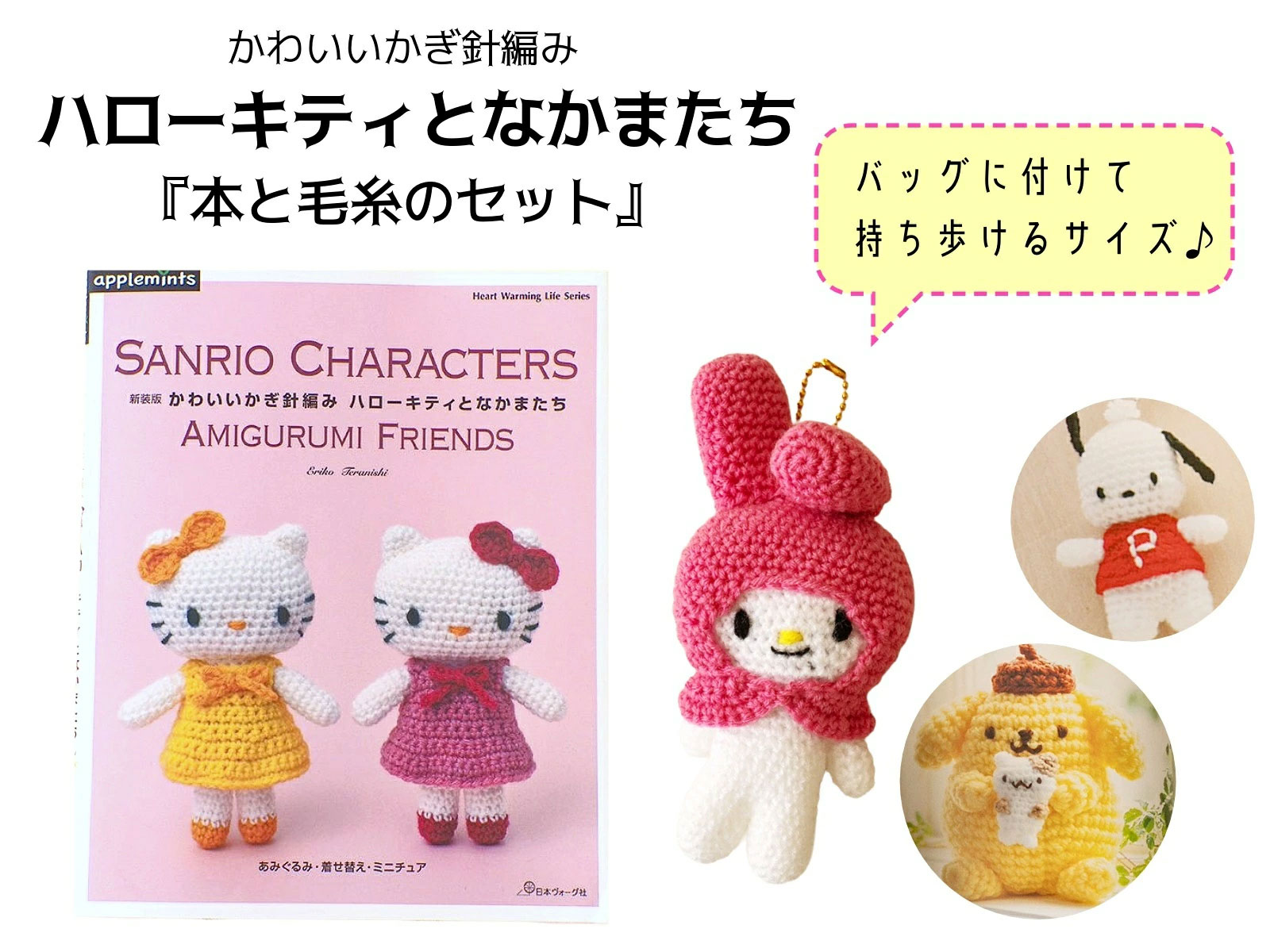かわいいサンリオキャラクターの小さなサイズの編みぐるみが編める、本と必要な量の毛糸が揃ったキット。