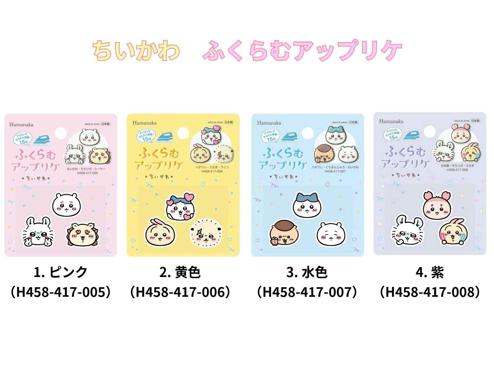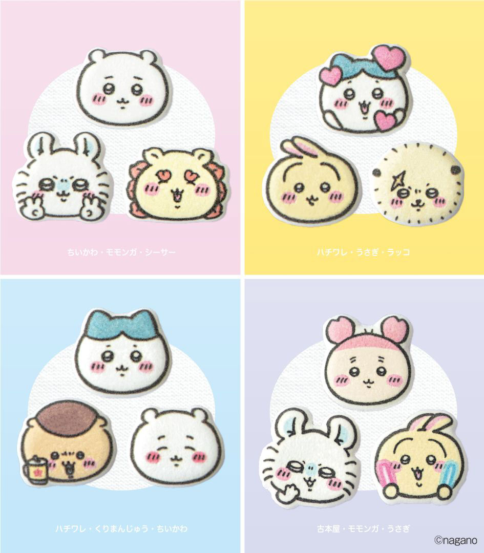 | 品番 | ピンク 【458-417-005】 ちいかわ・モモンガ・シーサー(各1枚入り) 黄色 【458-417-006】 ハチワレ・うさぎ・ラッコ(各1枚入り) 水色 【458-417-007】 ハチワレ・くりまんじゅう・ちいかわ(各1枚入り) 紫 【458-417-008】 古本屋・モモンガ・うさぎ(各1枚入り) |
