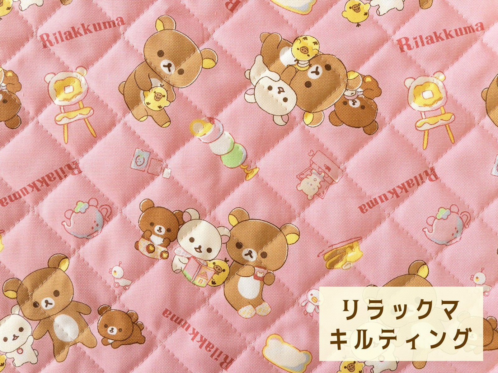 リラックマたちがおうちでまったりおやつの時間を楽しんでいるようなほっこりするデザインのキルティング生地。