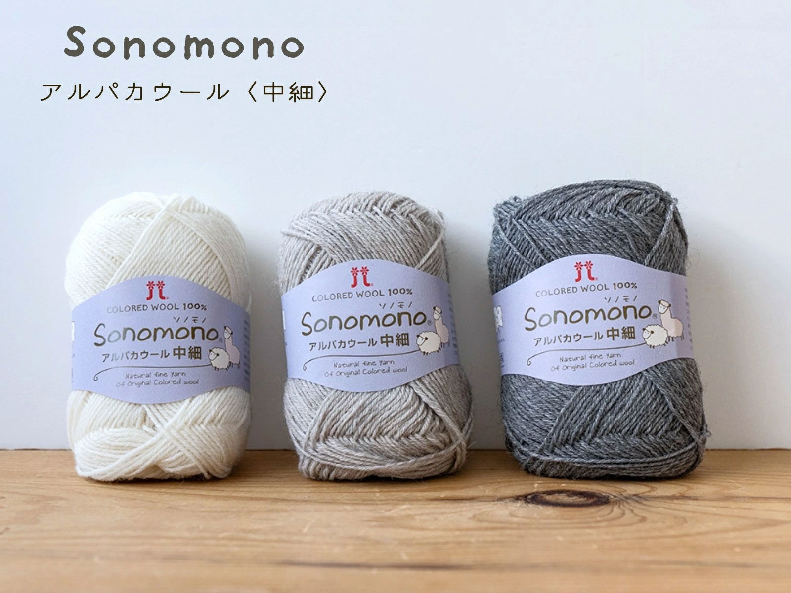 ナチュラルなカラーと風合いが魅力の人気の「ソノモノ」シリーズ、アルパカウール中細タイプ。