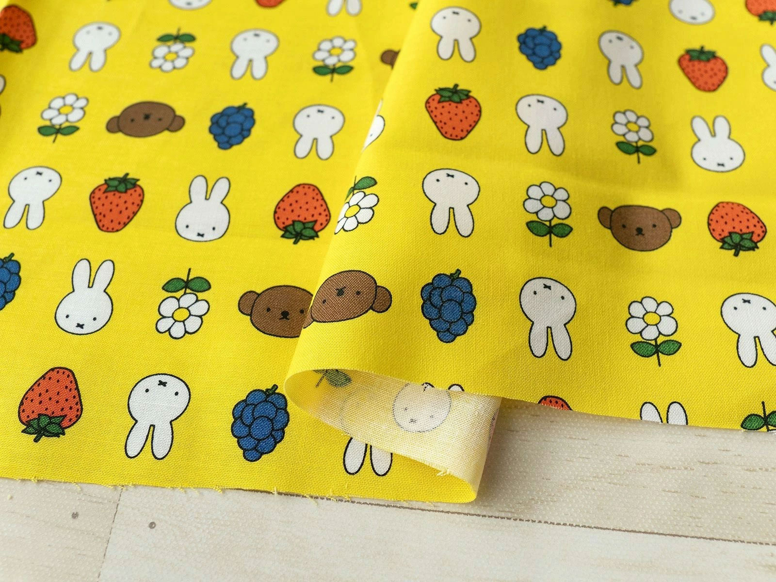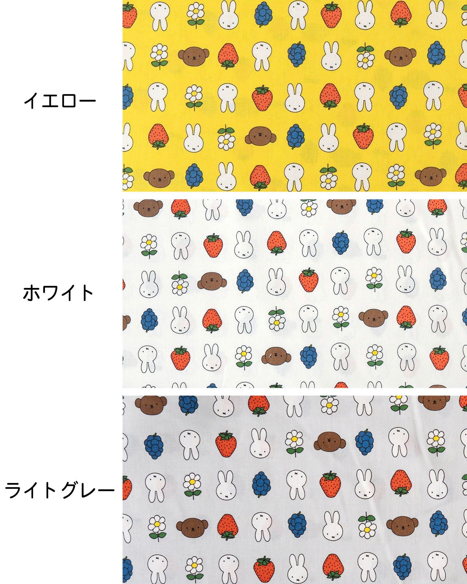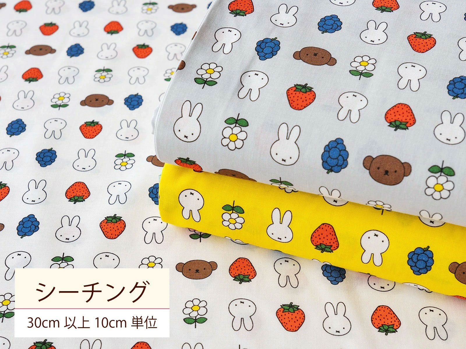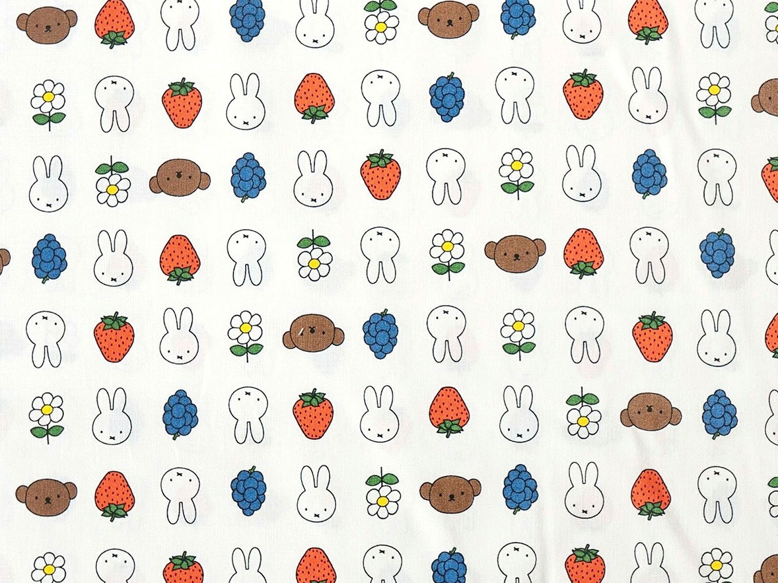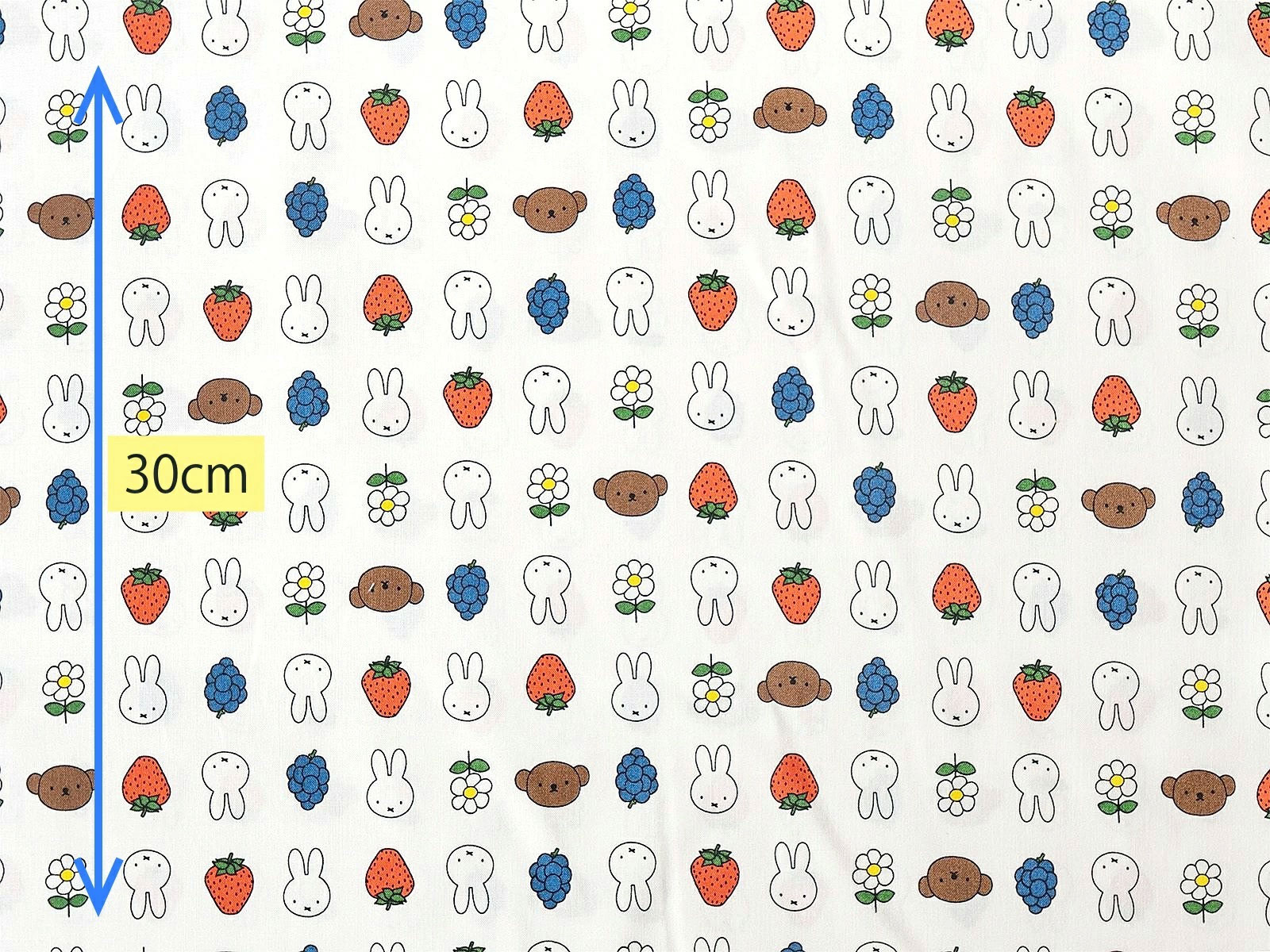かわいいミッフィーとフルーツ、お花が並んだシーチング生地