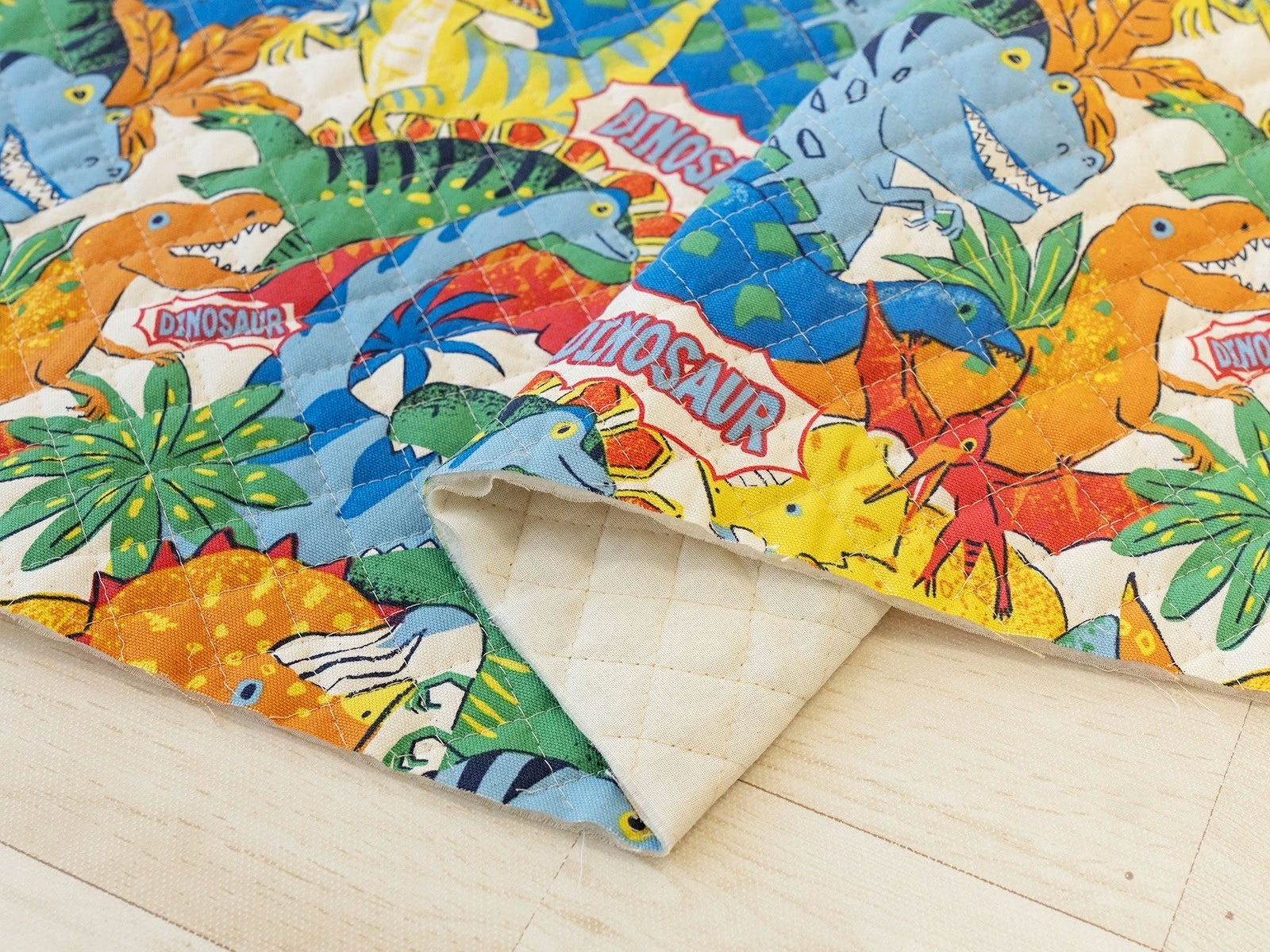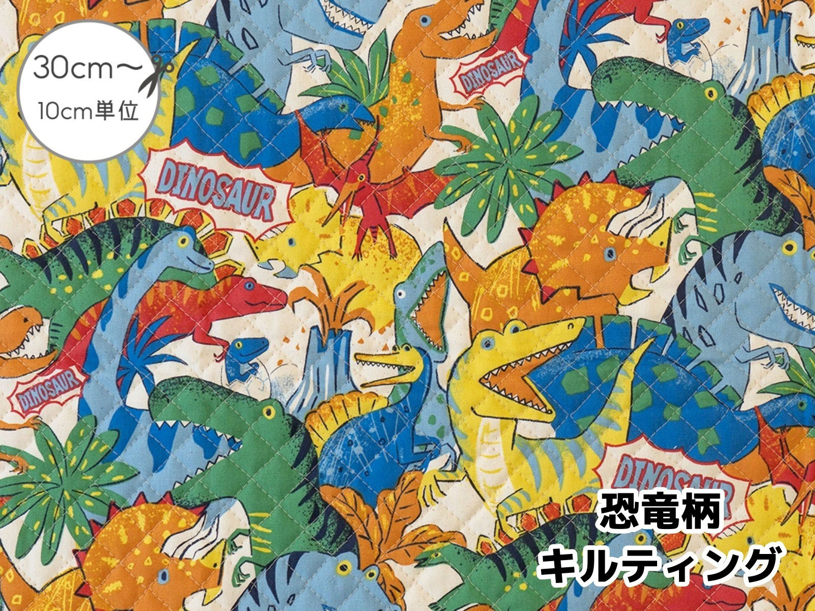 ダイナミックな恐竜たちを元気なカラーで賑やかに描いたキルティング生地。