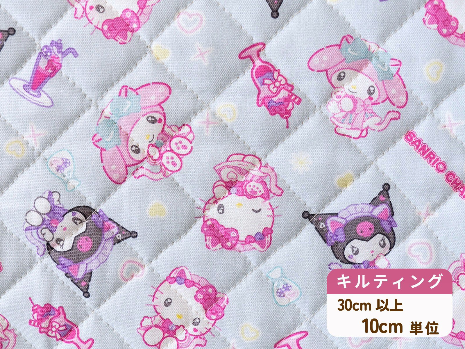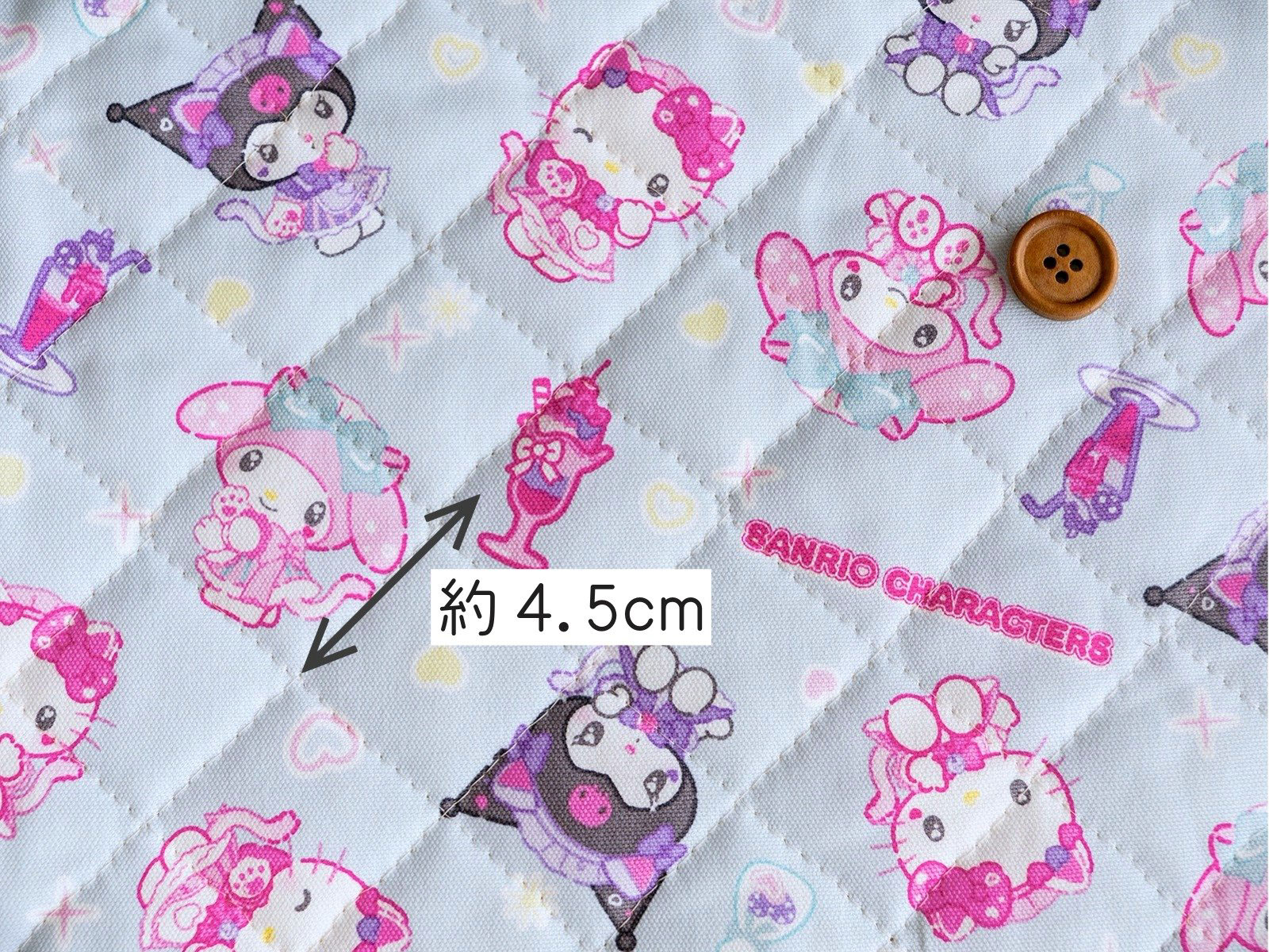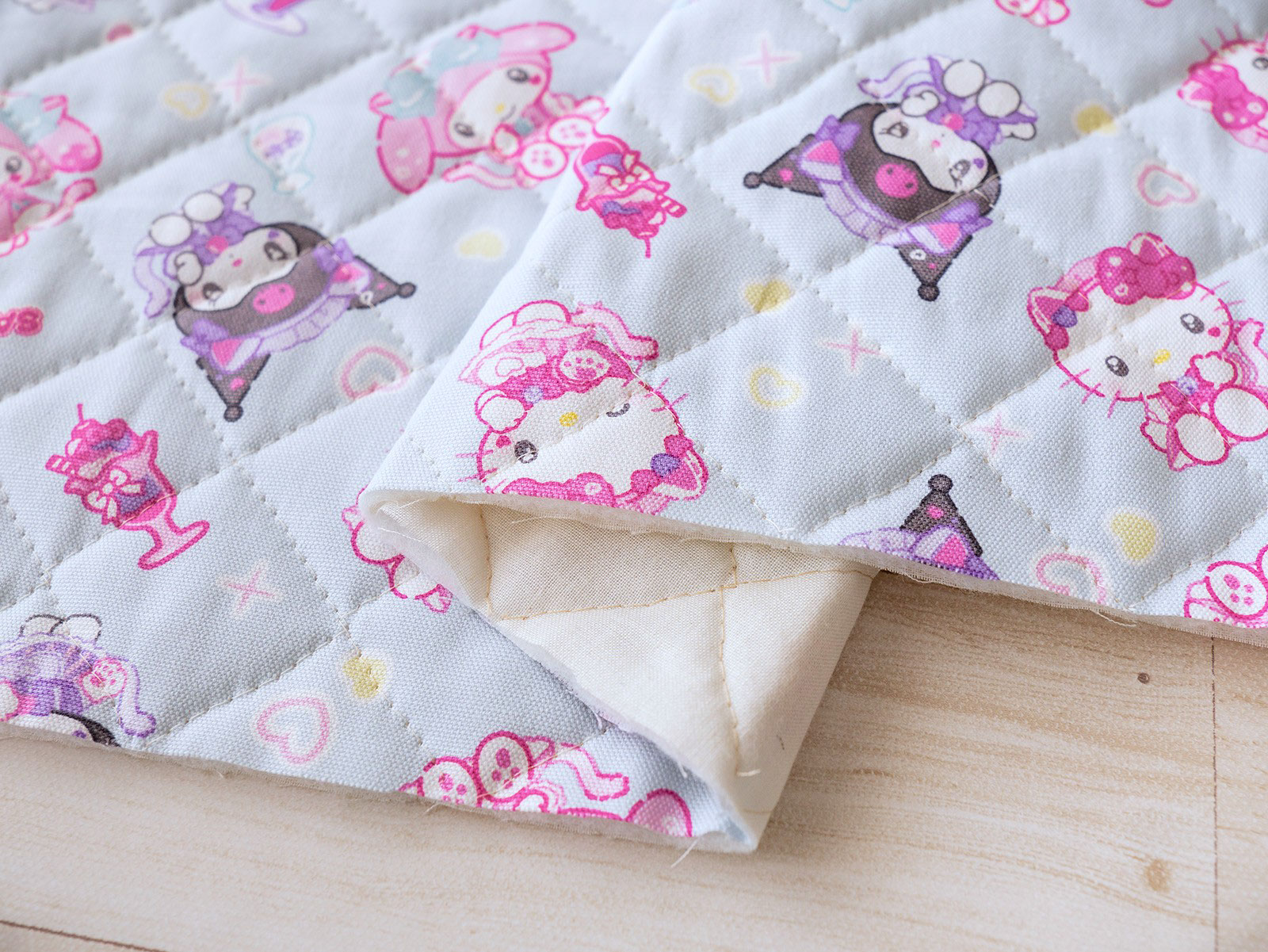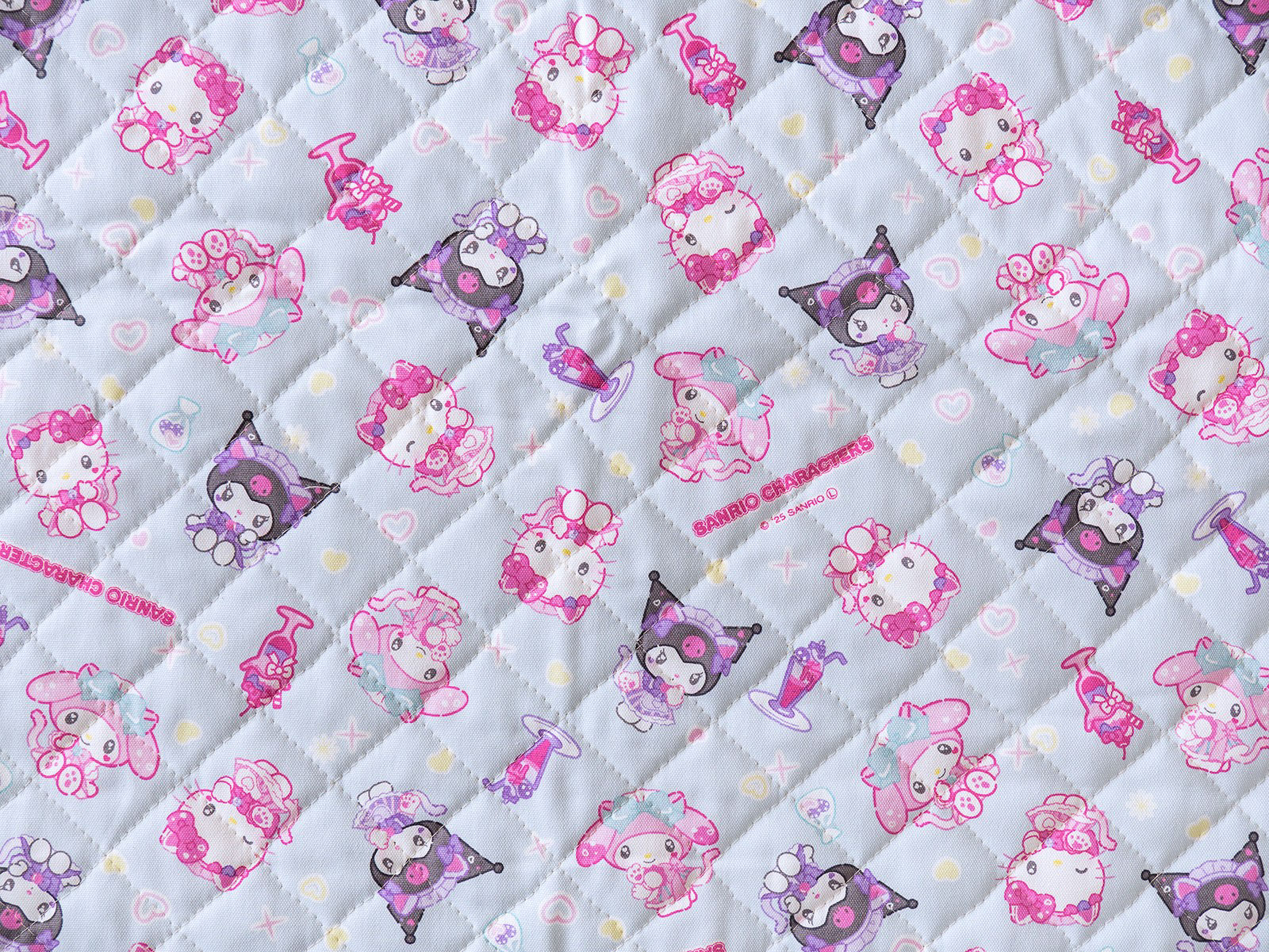 サンリオの人気キャラクター、ハローキティ、マイメロディ、クロミが、かわいいねこ耳メイドに扮したキュートなデザインのキルティング生地。