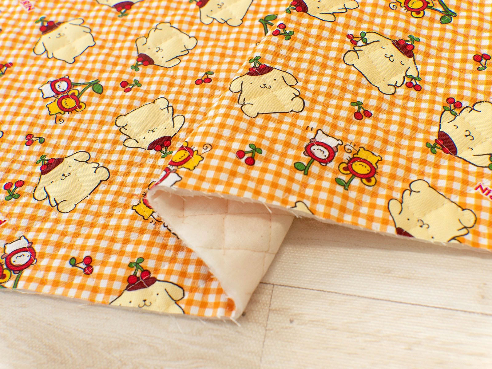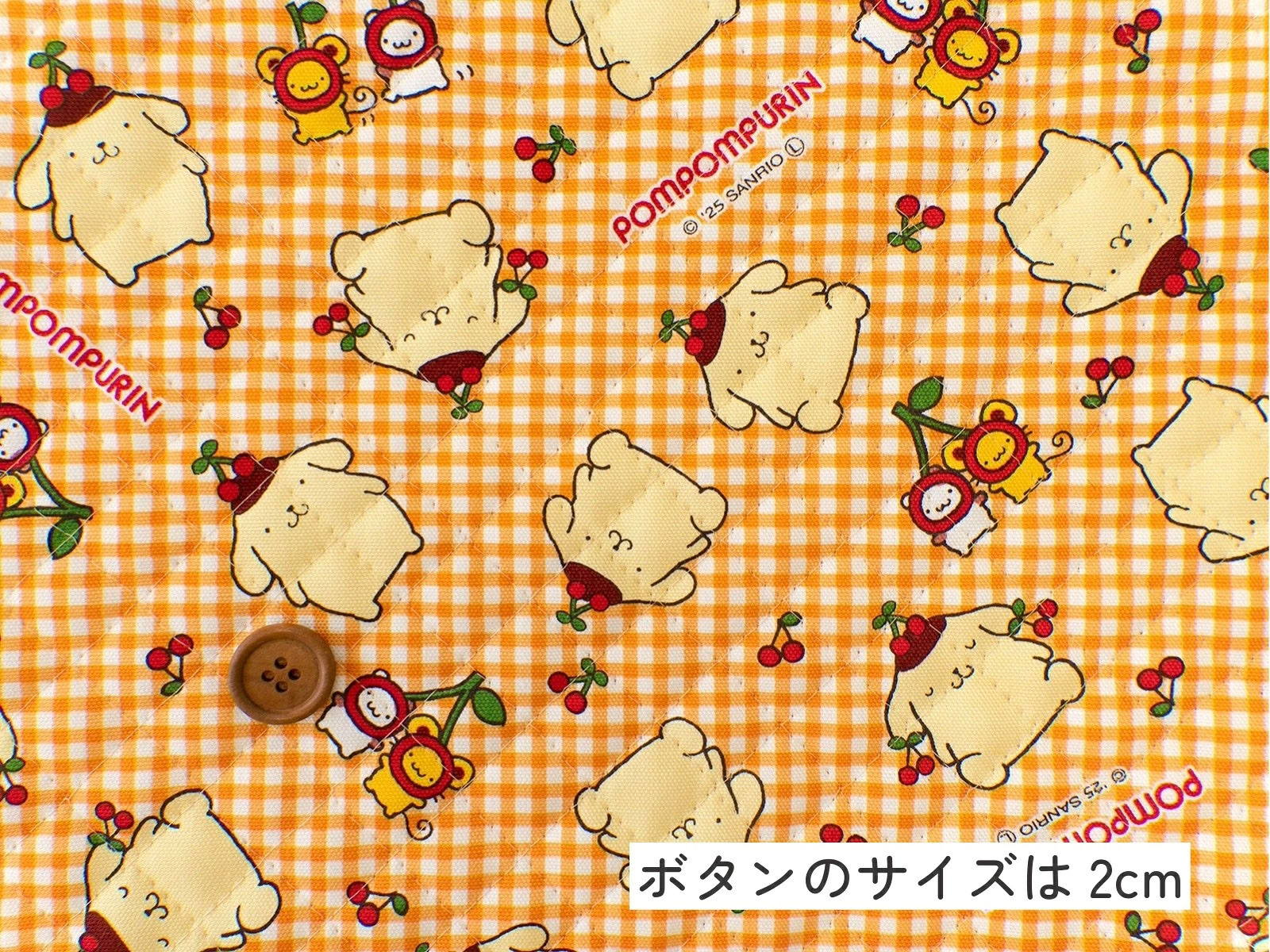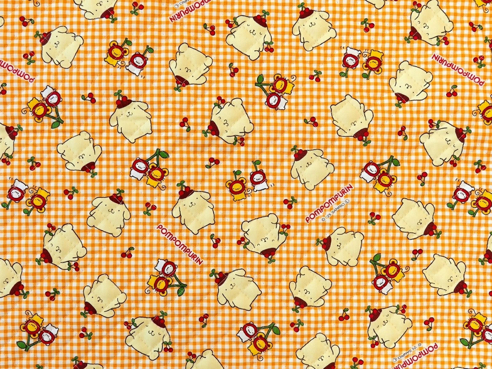 レトロなカラーのチェックが可愛いポムポムプリンのキルティング生地。