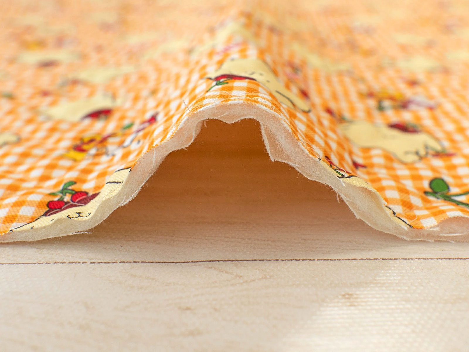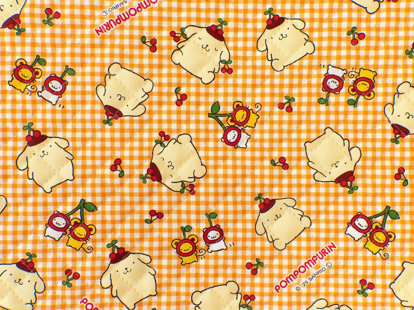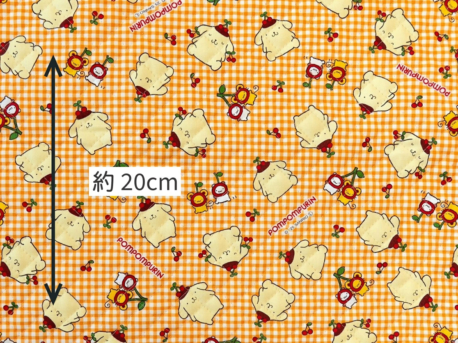 レトロなカラーのチェックが可愛いポムポムプリンのキルティング生地。
